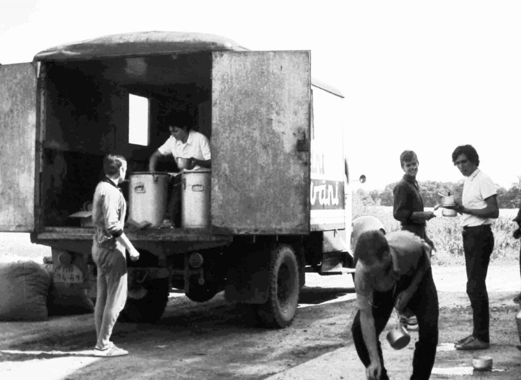 Hned první kontakty s nimi jsme měli konfliktní, to když se nám podařilo při svozu štoků na cestě z Činova do Břežan zachytit jejich telefonní linky a kousek cesty je popotáhnout. Po této zkušenosti jsme o další kontakt s nimi přestali mít zájem. Pracovní směny, alespoň pro naši partu strhávačů štoků byly poněkud časově protažené, protože jsme museli nakrmit kombajny (česačky chmele) i pro začátek následujícího dne, také ráno se jelo dřív a snídaně a obědy nám vozily do chmelnice, večeře po příjezdu do Břežan jsme měli přihřívané, to už osádky kombajnů byly dávno po sprchách a rozjížděly se podvečerní zábavy, samozřejmě většinou ve vlastní režii. My jsme ale preferovali větší volnost bez přílišné pozornosti pedagogického dozoru a ve finále také i větší výdělek.